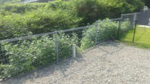 管理人Mは体にロープを巻きフェンスに固定して電動草刈り機で挑みます。